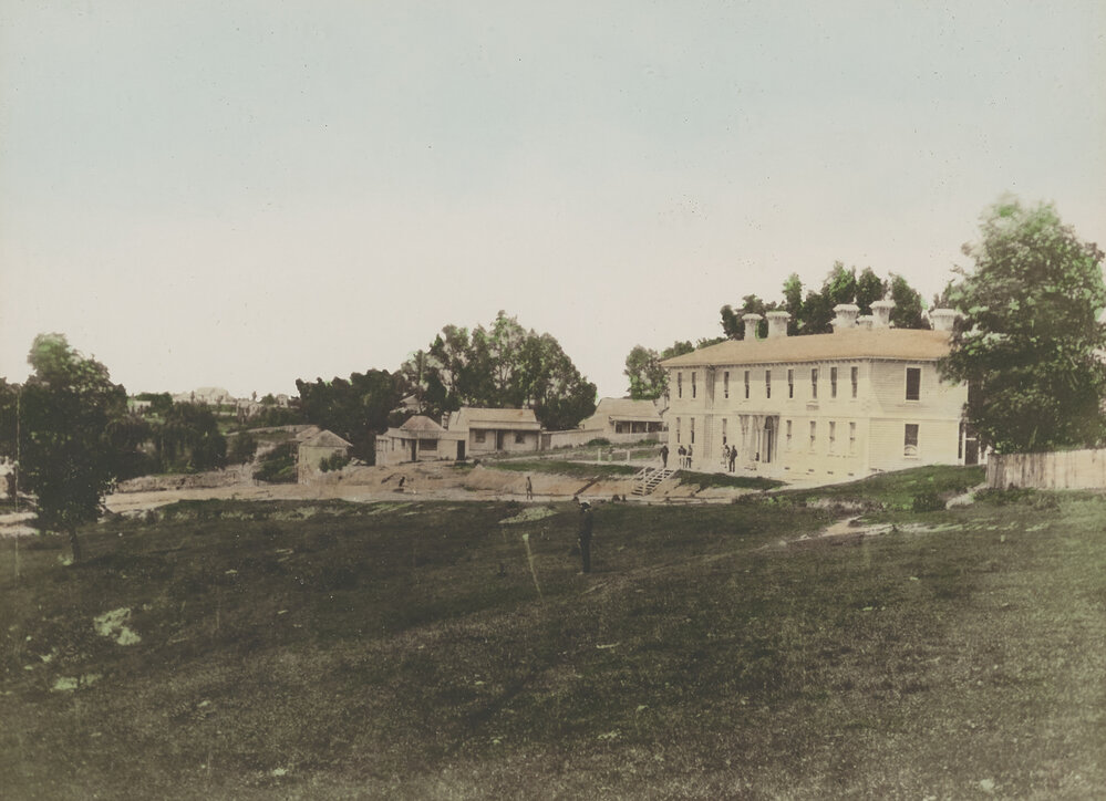 Date1880-1935Reference NumberPhoto 21-1283DescriptionTwo photos, one of the Government Buildings, the other of Edwardian Post Office that replaced it. Mounted beside each other in a wooden frame. One taken in 1880 and one in 1935.FormatPrint