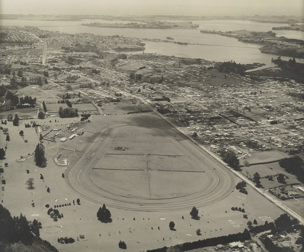 Datec. 1962Reference NumberPhoto 21-1309DescriptionAerial of Tauranga Racecourse at Greerton. Waimapū estaury in the background.FormatPrint