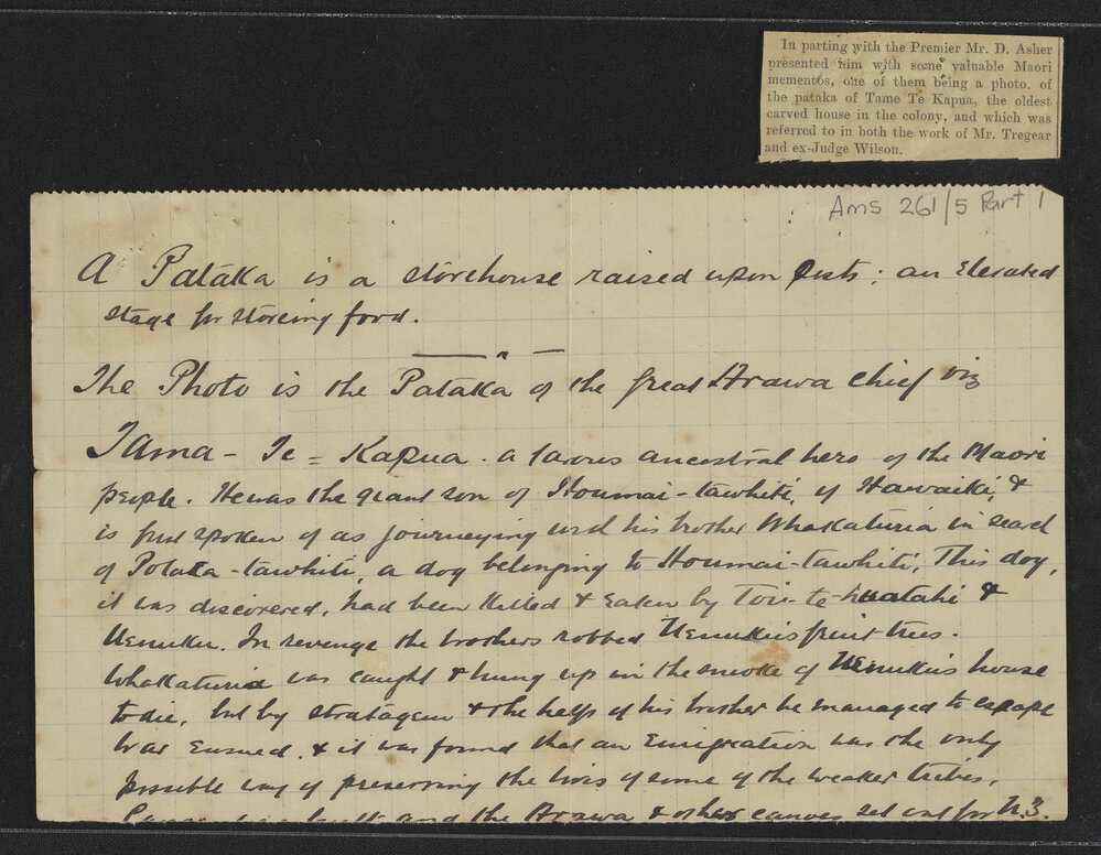 Small newspaper cutting attached to an explanation of 'Pataka' and a detailed history of Tama-te-kapua, who was the commander of the Te Arawa canoe.