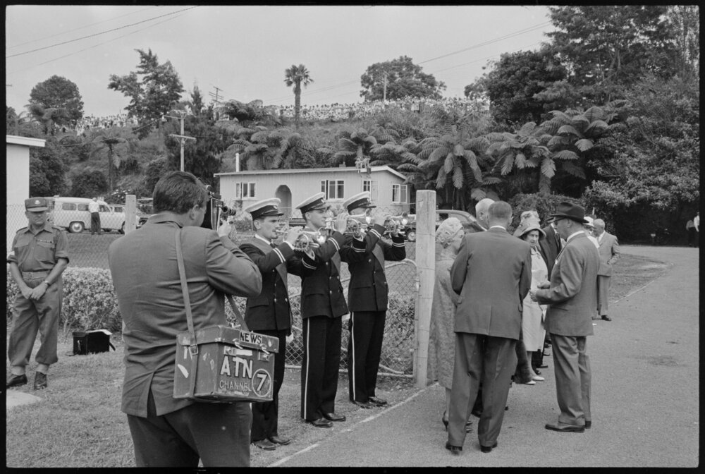 Date9 February 1963Reference NumberPhoto gcc-1632DescriptionTrumpeters at the Sound Shell, Mount Maunganui (during the visit of the Queen and Duke on the HMS Britannia)Physical Description35mm black-and-white negative (2/3)Photographer/CreatorBay of Plenty Times