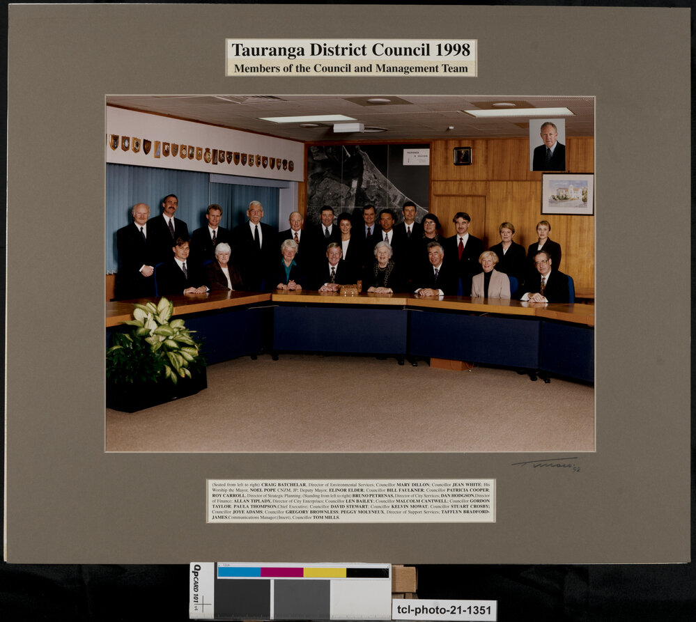 Date1998Reference NumberPhoto 21-1351DescriptionMembers of the Tauranga District Council and Management. Seated