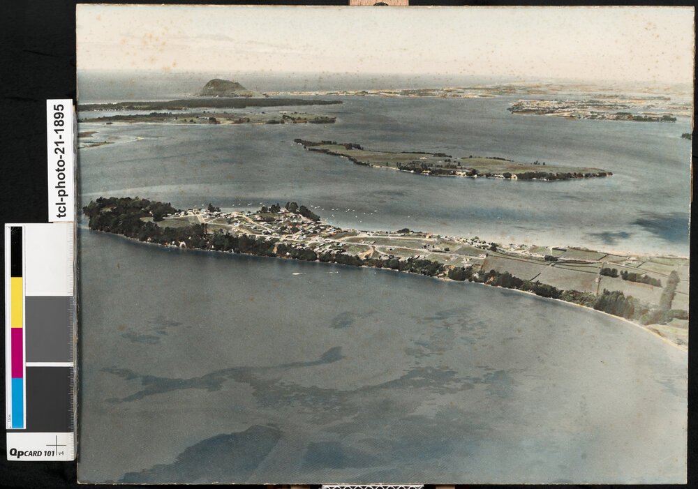 Reference NumberPhoto 21-1895DescriptionAerial of Ōmokoroa and Motuhoa island. Rangiwaea island, Matakana island, and Mauao in the background.