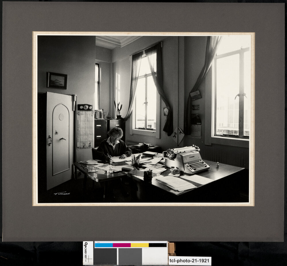 Reference NumberPhoto 21-1921DescriptionArchivist's office in 1987, showing Jinty Rorke at work. Written on reverse: "Dark grey outer white inner leave white edge to paint showingPhotographer/CreatorTulloch, Robert Scott