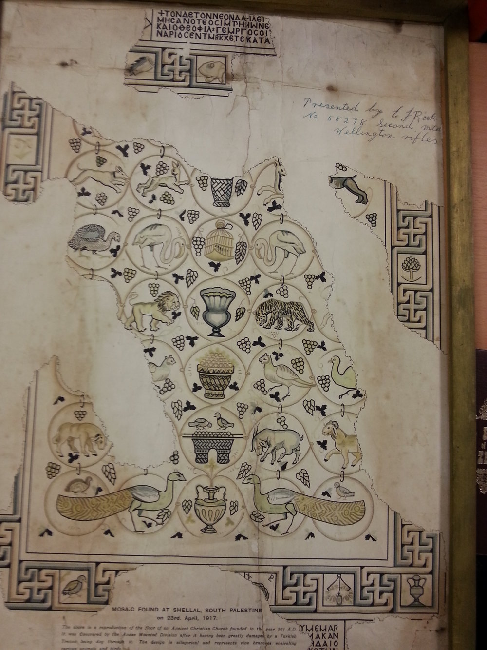 At some point in his life Ernest Rook made a presentation of the lithograph of the Shellal Mosaic. On a blank piece of the print someone wrote, in ballpoint pen, 'Presented by E. J. Rook / No 58278 Second Mtd / Wellington rifles'. The use of the ballpoint indicates that the gift was made in the 1950s or after. The recipient isn't recorded. But by the time it ended up in a Waikato antique shop, the picture was looking decidedly scruffy, and it is easy to see that from an aesthetic point of view it might have become surplus to requirements.