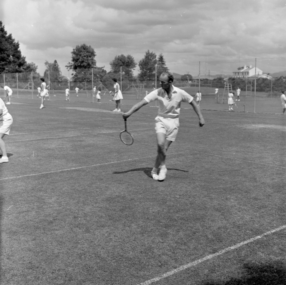 DateDecember 1960Reference NumberPhoto gca-312DescriptionTennis (unpublished)FormatNegativePhysical Description6x6cm cellulose triacetate black and white negativeSource of AcquisitionGifford-Cross Donation, 1992Photographer/CreatorBay of Plenty Times