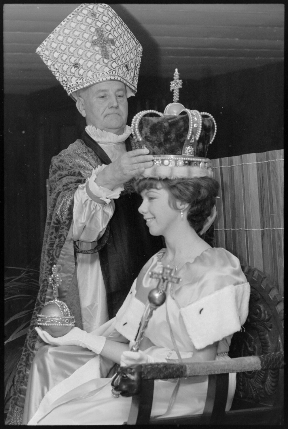 Date31 August 1964Reference NumberPhoto gcc-7132DescriptionOrange Festival. Crowning of Queen, Belinda Harding, by Archbishop Donald Groom. Published 31 August 1964.Physical Description35mm black-and-white negative (1/2)Photographer/CreatorBay of Plenty Times