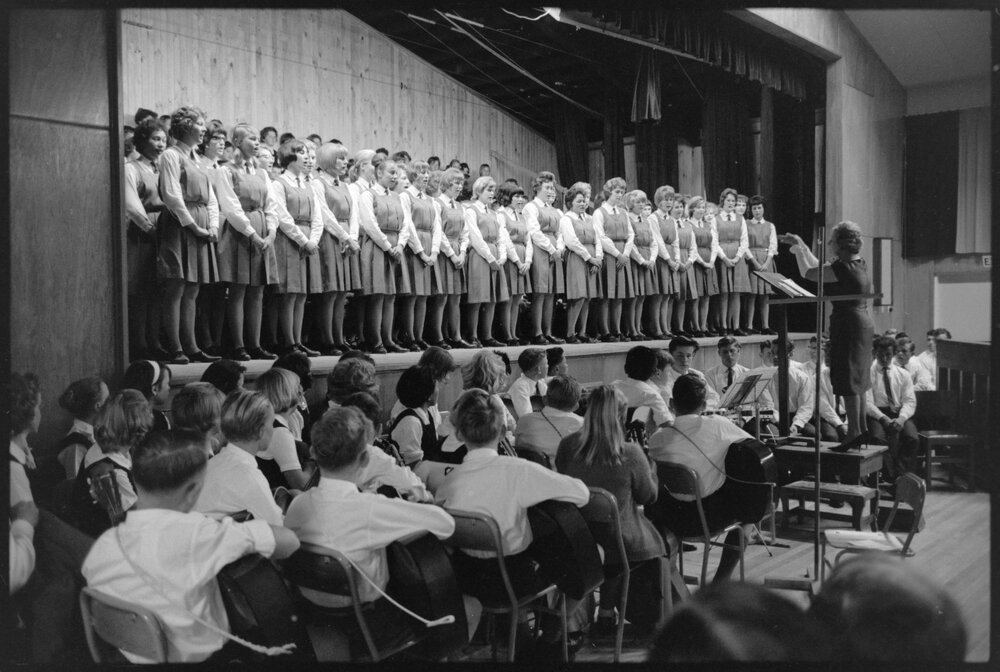 Date17 October 1964Reference NumberPhoto gcc-7680DescriptionTe Puke Primary School music festival. Massed choirs. Published 17 October 1964.Physical Description35mm black-and-white negative (2/3)Photographer/CreatorBay of Plenty Times