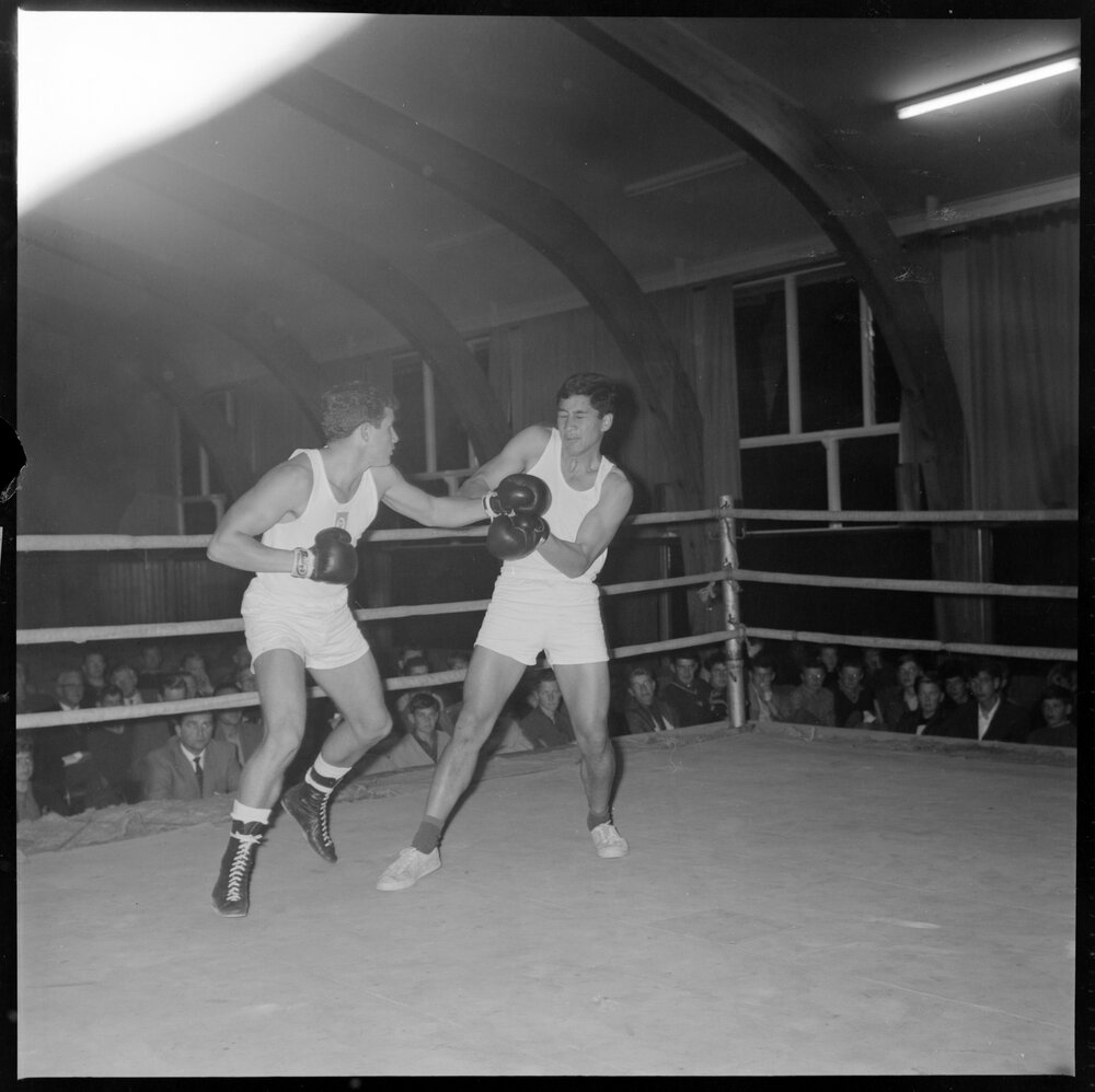 Boxing. D. Roper showing too much polish for A. Rolleston at Tauranga Boys' College boxing tournament. (27 September 1966). Pae Korokī, accessed 17/04/2026, https://paekoroki.tauranga.govt.nz/nodes/view/70939