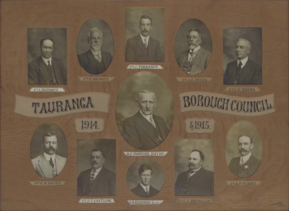 Date1914 to 1915Reference NumberPhoto 21-1330Description1914 & 1915 Tauranga Borough Council. Top L to R: J. Murdoch, R. Badger, J. Torrance, J.G. Green, J.C. Adams. Bottom L to R: C.W. Brown, H.T. Castaing, R.B. Shearman (Town clerk), C.E. Macmillan, A.F. Tunks.FormatPrintPhotographer/CreatorMeers, Robert Walter, 1859-1929