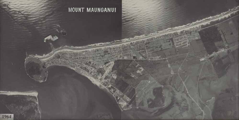 Date1964Reference NumberPhoto 21-1337DescriptionAerial of Mount Maunganui. Matakana island is shown on the bottom left.FormatPrint