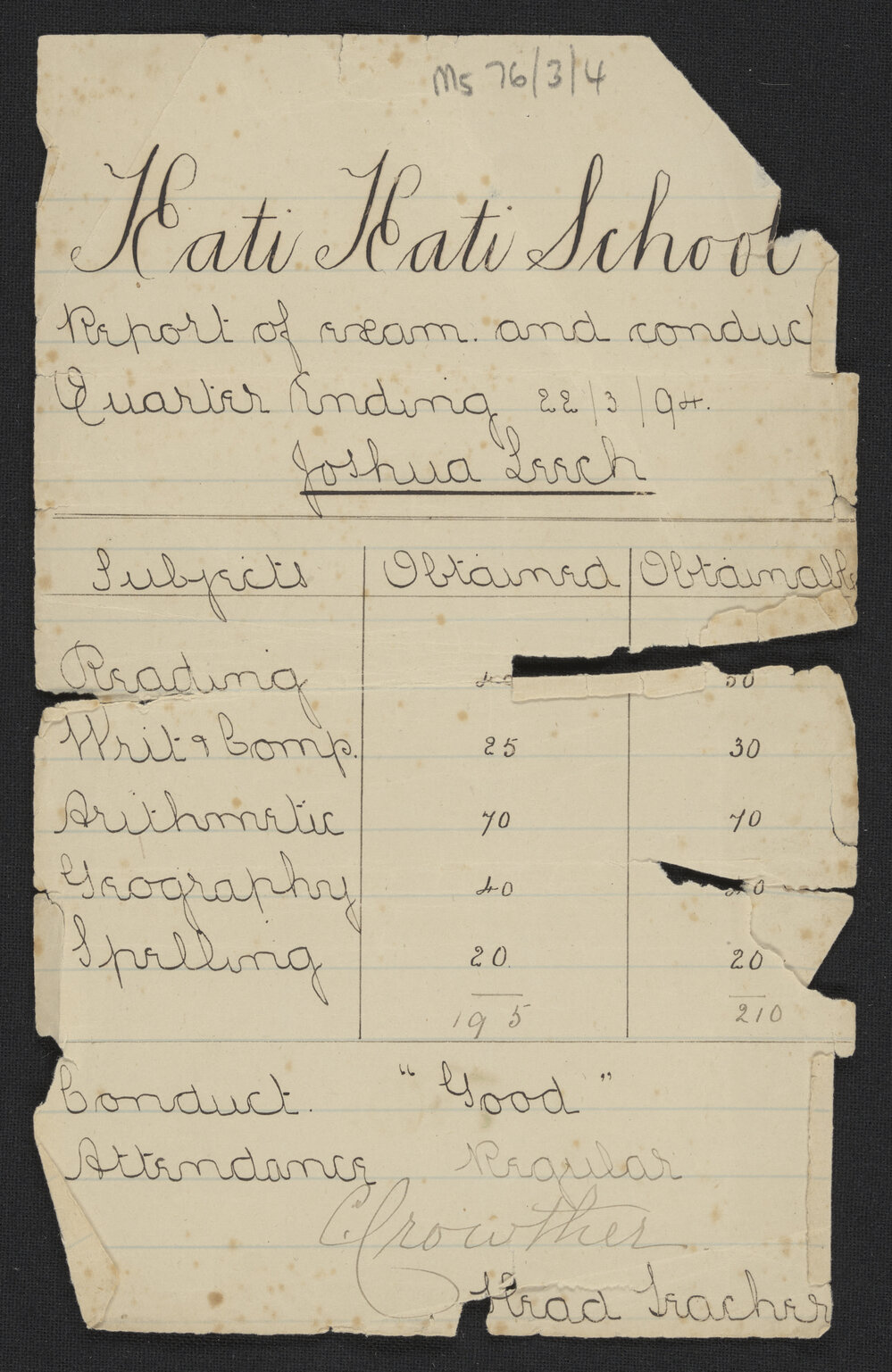 Katikati School, Katikati School report for Joshua Leech, 1894 (1894). Pae Korokī, accessed 17/04/2026, https://paekoroki.tauranga.govt.nz/nodes/view/74619