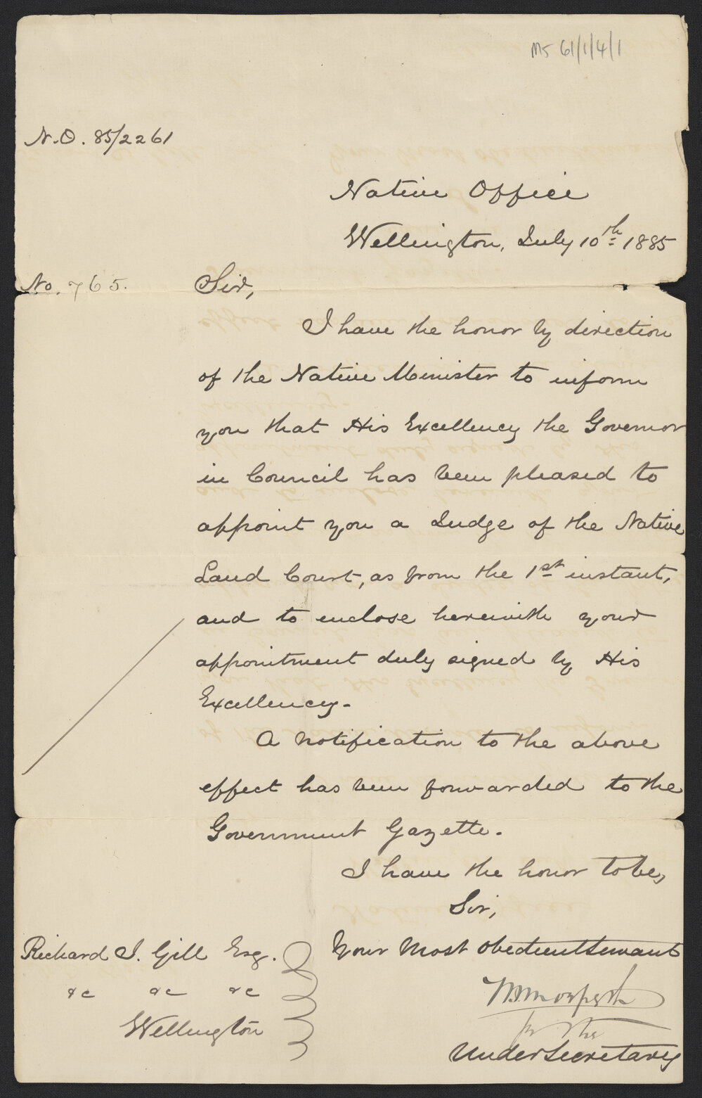 New Zealand. Native Office, Letter of appointment as Judge of the Native Land Court, 1885 (10 July 1885). Pae Korokī, accessed 17/04/2026, https://paekoroki.tauranga.govt.nz/nodes/view/74634