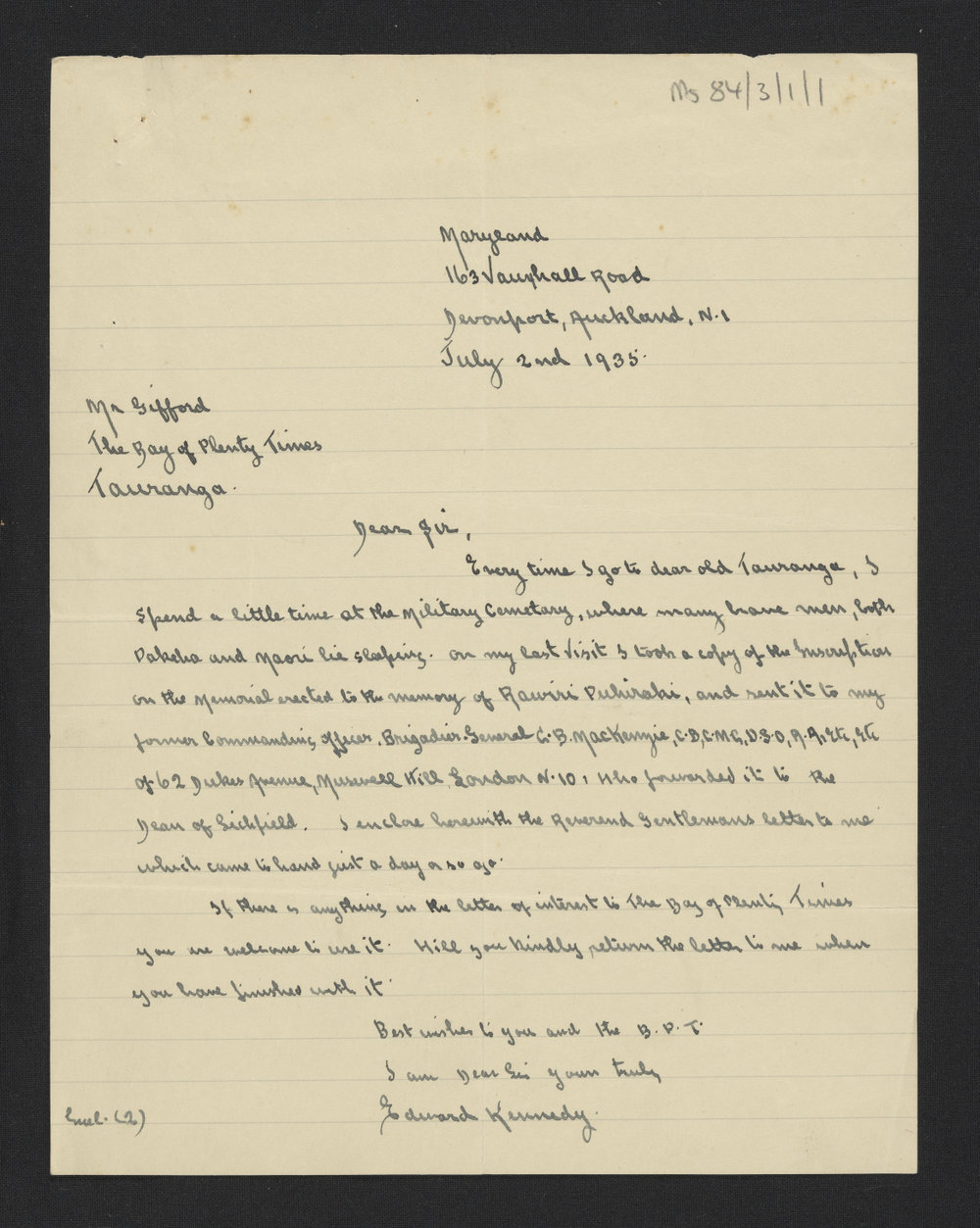 Tucker, H. W. (Henry William), 1830-1902, Enclosure C from Edward Kennedy to Mr Gifford, 1935 (23 May 1935). Pae Korokī, accessed 25/03/2026, https://paekoroki.tauranga.govt.nz/nodes/view/74812