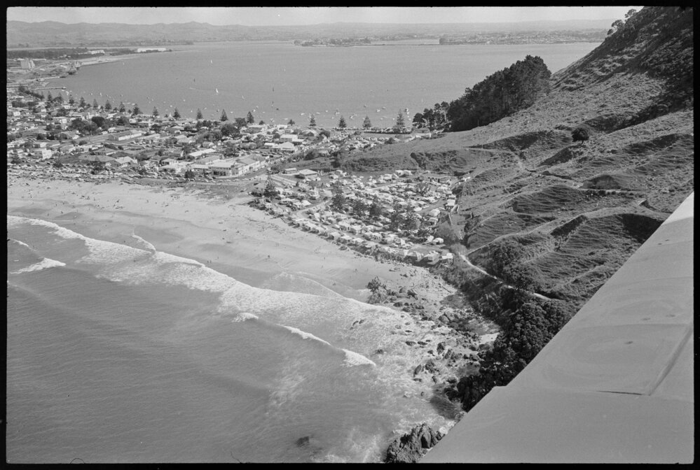 Date4 February 1965Reference NumberPhoto gcc-8479DescriptionAerial picture of Mount Maunganui camping grounds. Not published.Physical Description35mm black-and-white negative (3/3)Photographer/CreatorBay of Plenty Times