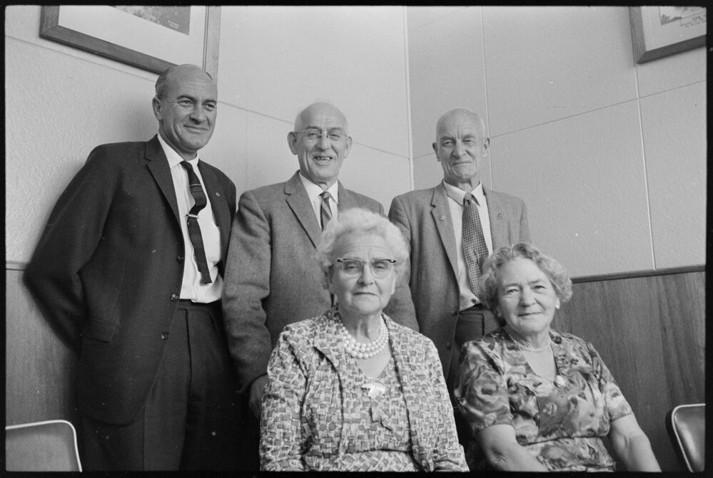 Date23 February 1965Reference NumberPhoto gcc-8778DescriptionMason family. LTR: George, Mr and Mrs D. Mason of Canada, Mr and Mrs George Mason of Napier. Women's page. Published 23 February 1965.Physical Description35mm black-and-white negative (3/4)Photographer/CreatorBay of Plenty Times