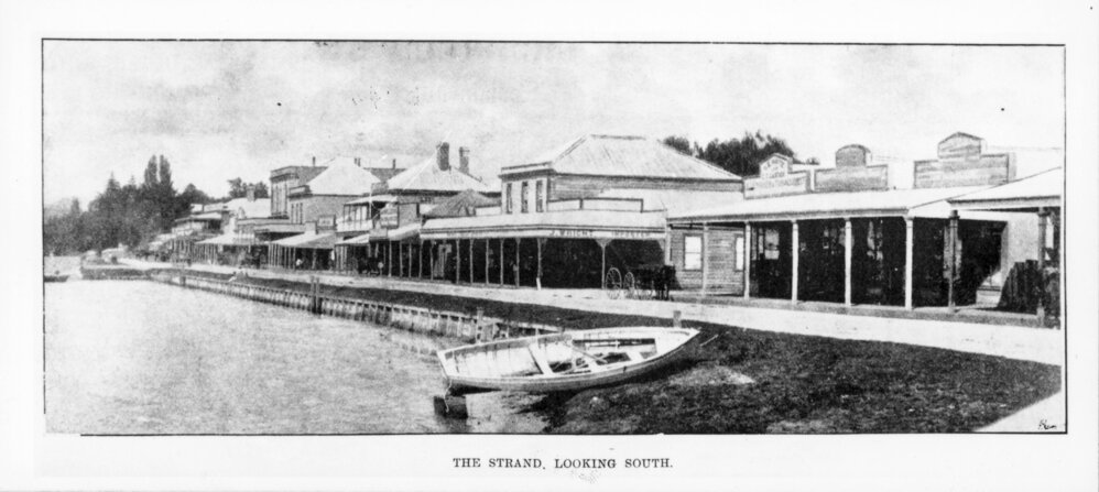 Reference NumberPhoto 04-263DescriptionThe Strand, Tauranga, looking south. Photo published in The Weekly Press, 9 October 1901. Shows J. Wright, Importer, and small boat drawn up on beach. Acc No 1966