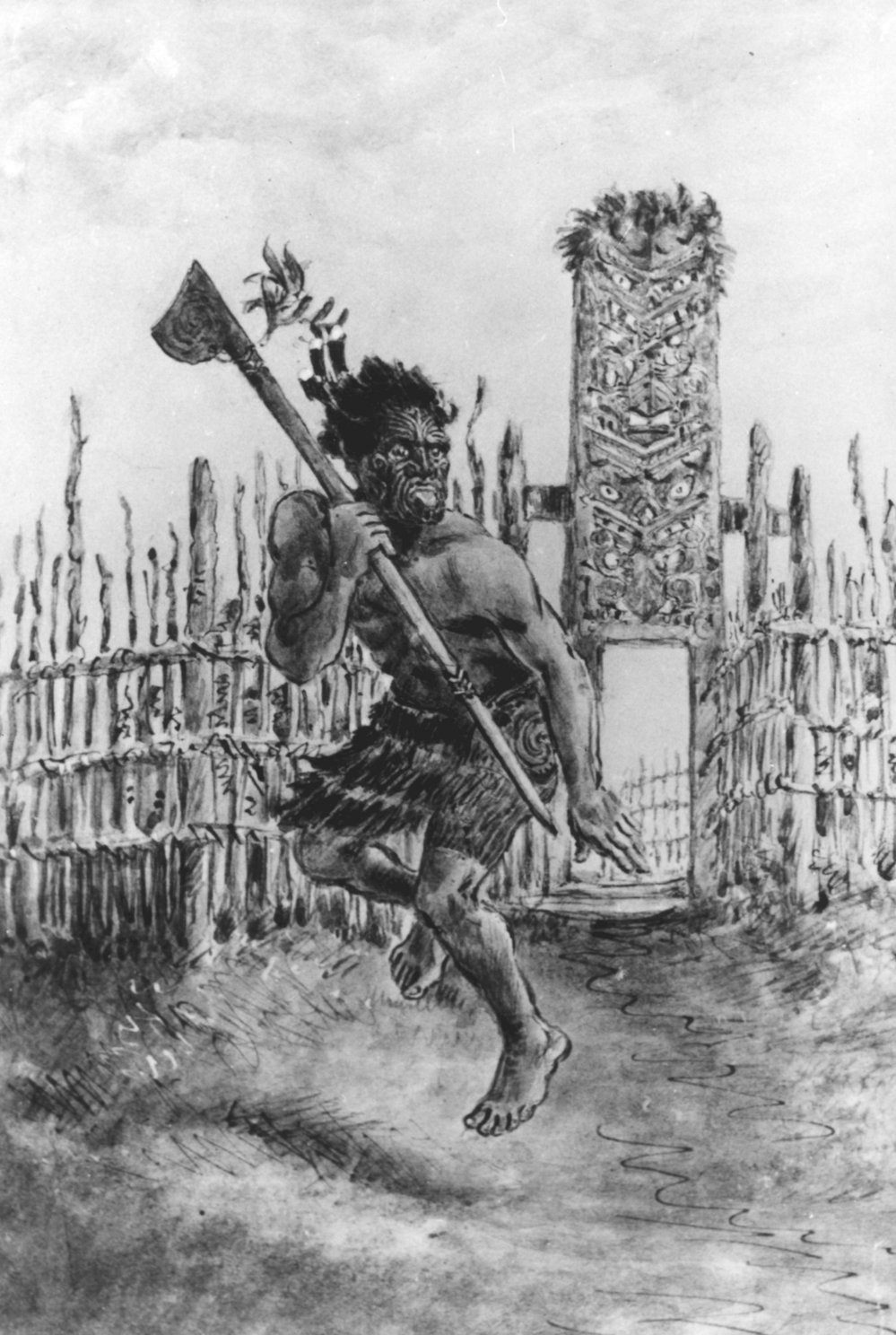 Reference NumberPhoto 04-322DescriptionRESTRICTED - REX NAN KIVELL COLLECTION, NATIONAL LIBRARY OF AUSTRALIA "Arawa Pā at Maketū, Oct. 1865. Artist warned off sketching the gate and palisade. Name of the Māori Hoete Paeterori..." Photo of wash drawing by H. G. Robley