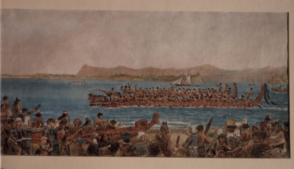 Reference NumberPhoto 05-022DescriptionWater colour by Robley of waka (canoe) race at (Te Awanui) Tauranga Harbour Dec 29 1865. 5 waka took part in the race. Hori Tupea (from Ōtūmoetai) lead the winning waka. Image likely to be have been reproduced from a sketch taken during the race. See also 05-038 which is a sketch of the same race. Ref: The Historical Society's 'Horatio Gordon Robley'