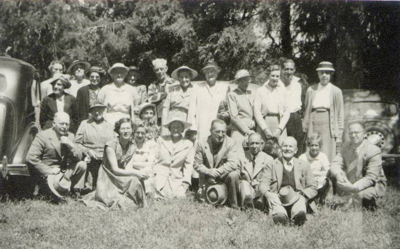 Standing: White-haired man 7th from left is not Lionel Adams; Marion Wilson 8th from left; Mary McPetrie 9th from left; Kathleen Adams 11th from left; Bertha Adams 13th from left/[extreme right] (not Olga?).