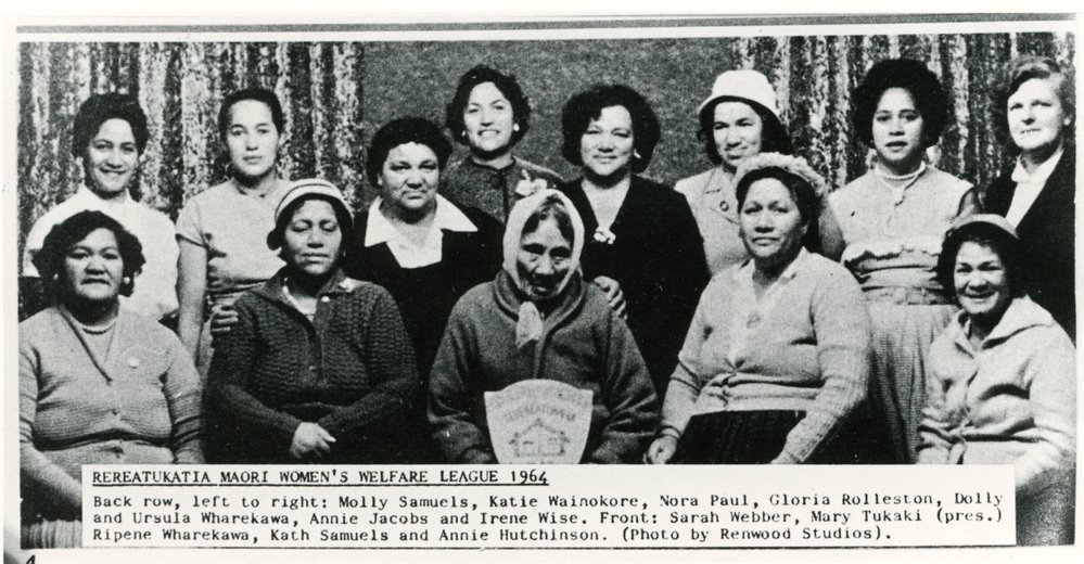 Reference NumberPhoto 07-406DescriptionRereatukahia Māori Women's Welfare League 1964. Back row, l to r: Molly Samuels, Katie Wainokore, Nora Paul, Gloria Rolleston, Dolly and Ursula Wharekawa, Annie Jacobs and Irene Wise. Front: Sarah Webber, Mary Tukaki (pres.), Ripene Wharekawa, Kath Samuels and Annie Hutchinson. Photo by Renwood Studios. From Photo News 25 July 1964 p4.Photographer/CreatorRenwood Studios
