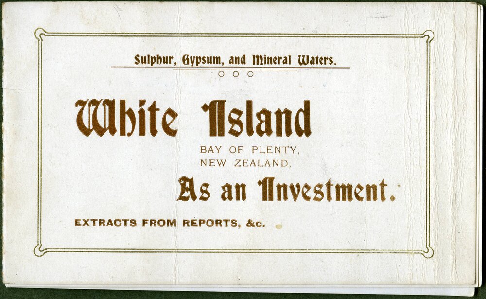 Reference NumberPhoto 12-188DescriptionCover of booklet advertising White Island, c 1908 (includes extracts from 1907 New Zealand Official Year Book). Printed by Turnbull, Hickson & Gooder, Printers, Wellington. Pasted into Bernard Sladden's album, Ms 33c/2.