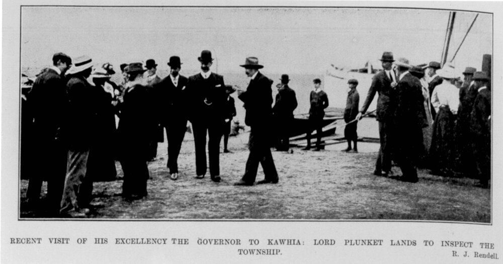 Caption below: Recent visit of his Excellency the Governor to Kāwhia: Lord Plunket lands to inspect the township.