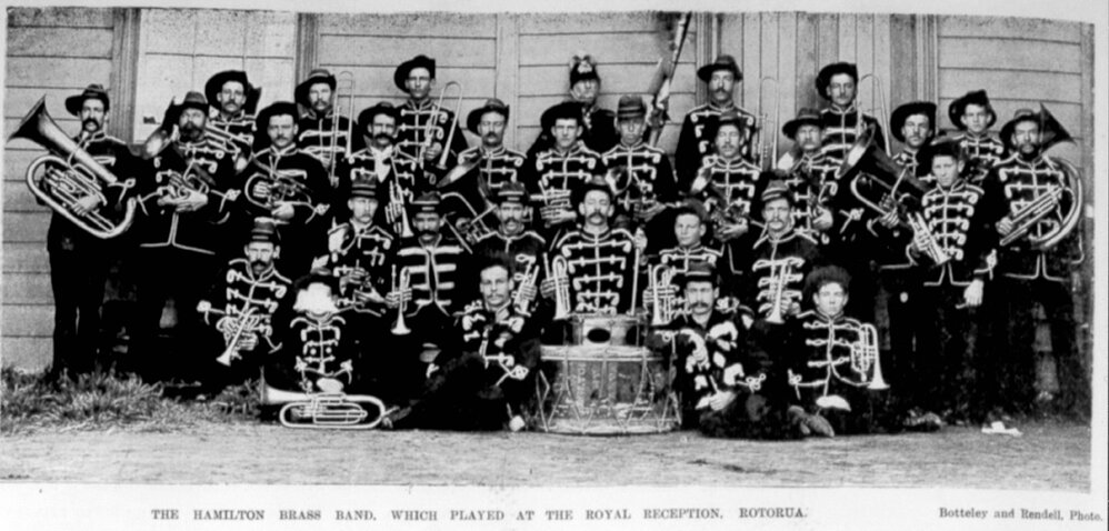 Caption below: The Hamilton Brass Band, which played at the Royal Reception, Rotorua.