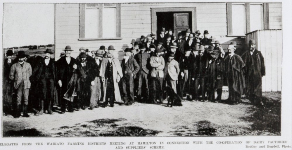 Caption below: Delegates from the Waikato Farming Districts meeting at Hamilton in connection with the co-operation of dairy factories and suppliers' scheme.