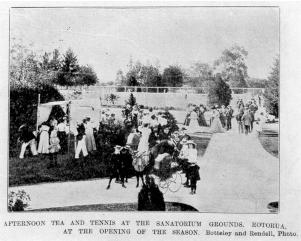 Caption below: Afternoon tea and tennis at the Sanatorium grounds, Rotorua at the opening of the season.