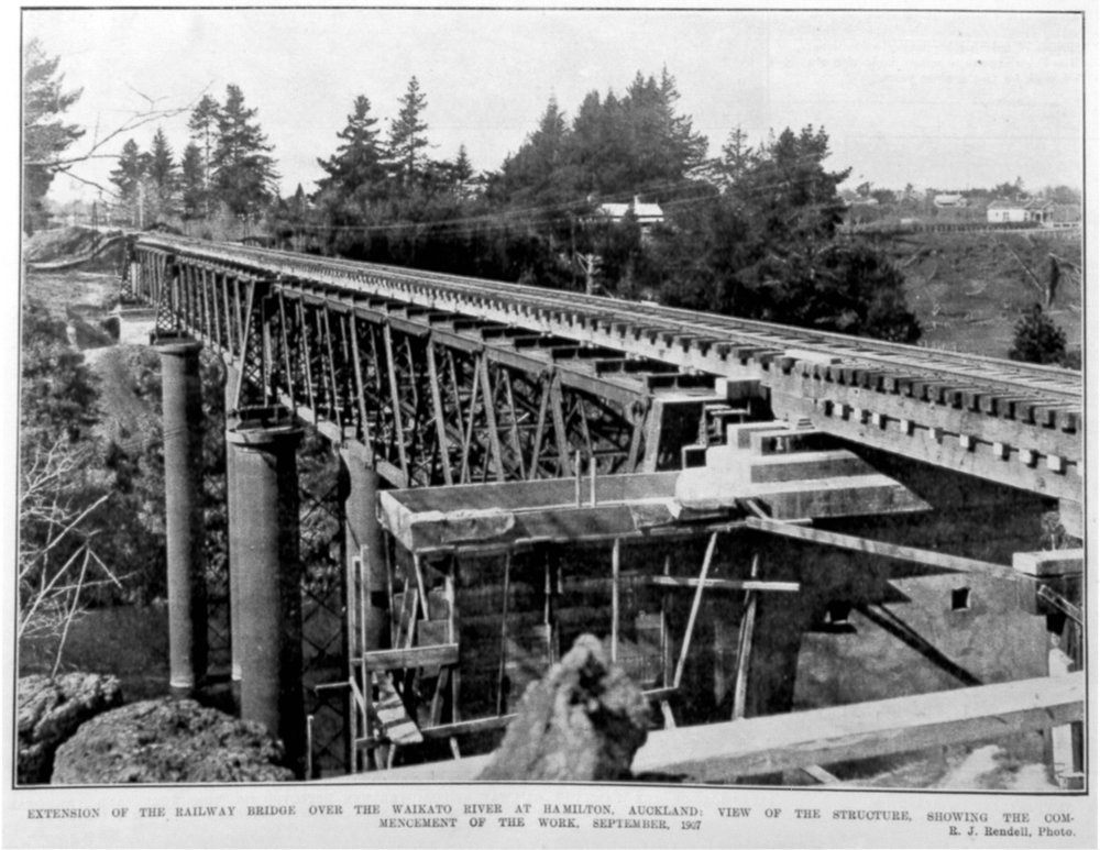 Caption below: Extensions of the Railway Bridge over the Waikato River at Hamilton, Auckland. View of the structure, showing the commencement of the work. September 1907.