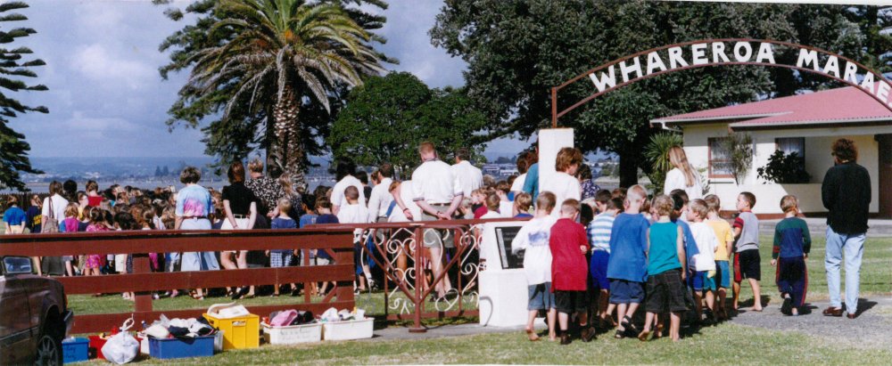 Reference NumberPhoto 13-1116DescriptionPhotograph of Mount Maunganui Primary School welcome to Whareroa Marae 1995. From images collected during centenary celebrations 2013.