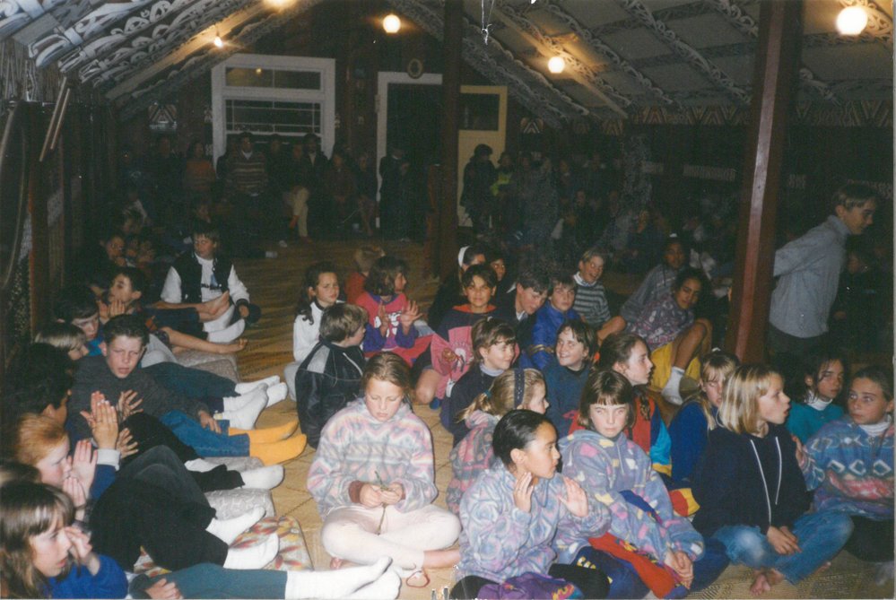Reference NumberPhoto 13-1117DescriptionPhotograph of Mount Maunganui Primary School in wharenui during Whareroa Marae visit 1995. From images collected during centenary celebrations 2013.
