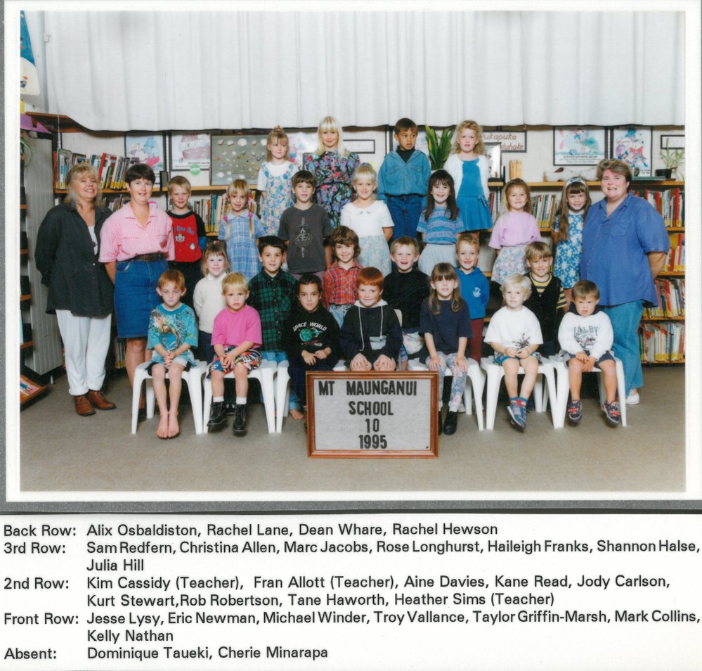 Reference NumberPhoto 13-481DescriptionPhotograph of Mount Maunganui School Room 10 1995. From images collected during Centenary celebration 2013. Back Row: Alix Osbaldiston - Rachel Lane - Dean Whare - Rachel Hewson 3rd Row: Sam Redfern - Christina Allen - Marc Jacobs - Rose Longhurst - Haileigh Franks - Shannon Halse - Julia Hill 2nd Row: Kim Cassidy (Teacher) - Fran Allott (teacher) - Aine Davies - Kane Read - Jody Carlson - Kurt Stewart - Rob Robertson - Tane Haworth - Heather Sims (Teacher) Front Row: Jesse Lysy - Eric Newman - Michael Winder - Troy Vallance - Taylor Griffin-Marsh - Mark Collins - Kelly Nathan Absent: Dominique Taueki - Cherie Minarapa
