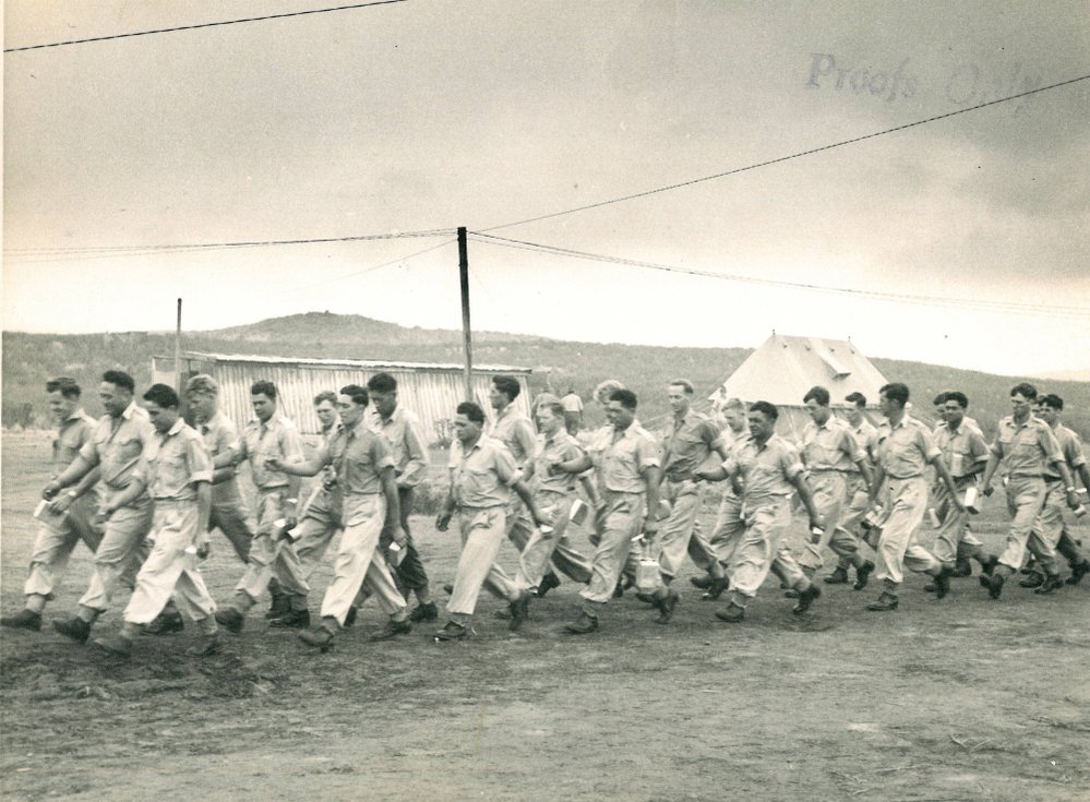 Reference NumberPhoto 13-912DescriptionACKNOWLEDGEMENT HAURAKI REGIMENT. Acc No 121/11/93. JP 109 7. Photograph of casually dressed soldiers in campground heading off to the Mess with mess tins in hand. Noted with file 'C Coy mess parade Tihoi'. Part of a collection of photos from the 1950s. Stamped on reverse 'John D Jones - Studio & Candid Photographer - Tokoroa'.