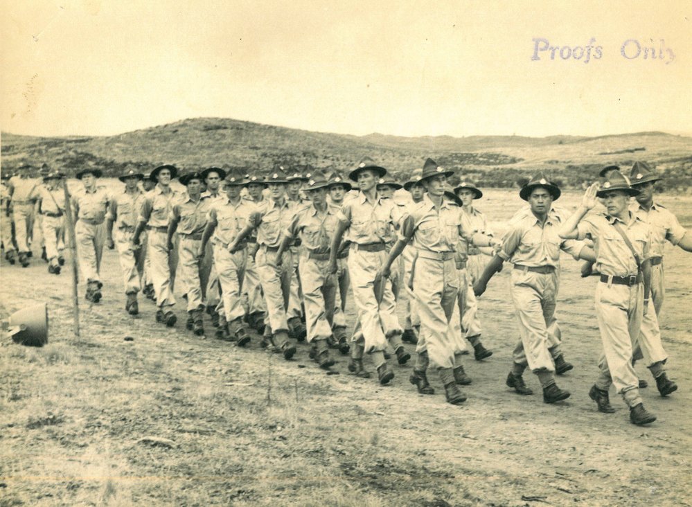Reference NumberPhoto 13-918DescriptionACKNOWLEDGEMENT HAURAKI REGIMENT. Acc No 121/11/93. JP110 3. Photograph proof of soldiers marching. Noted with file 'Tihoi mid 1950s. Lt Stan Gilpin Leading’. Stamped on reverse ‘John D Jones Studio and Candid Photographer Tokoroa’.
