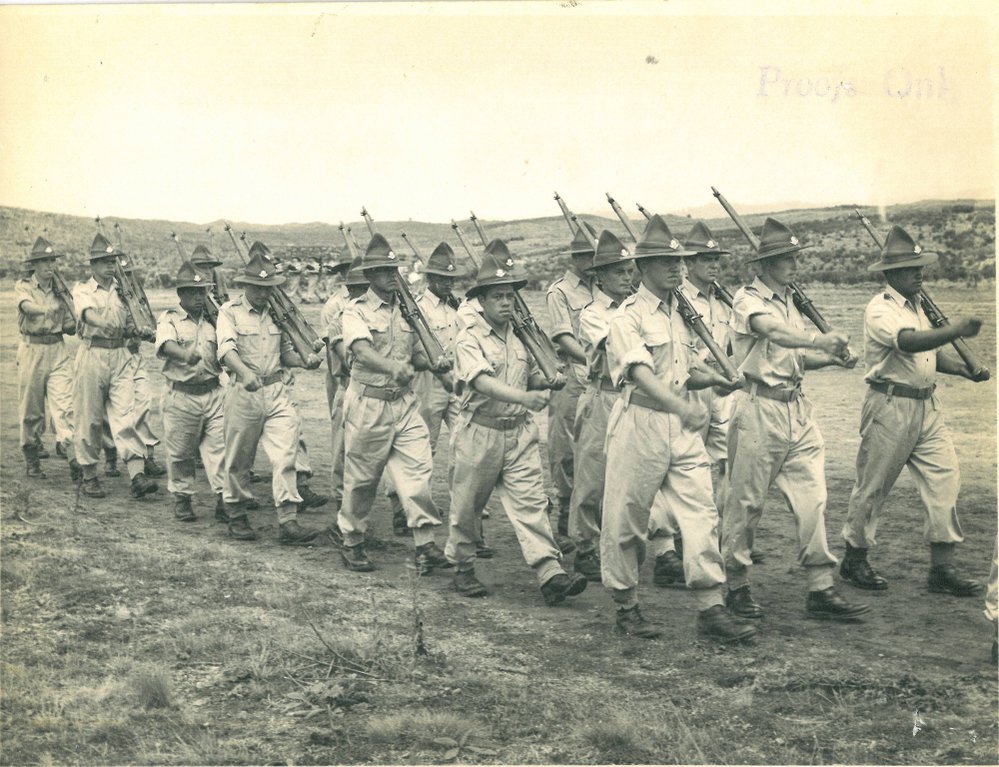 Reference NumberPhoto 13-928DescriptionACKNOWLEDGEMENT HAURAKI REGIMENT. Acc No 121/11/93. Photograph of soldiers marching in Tihoi during the 1950s. JP 110/12. Stamped on reverse 'John D Jones Studio & Candid Photographer, Tokoroa'.