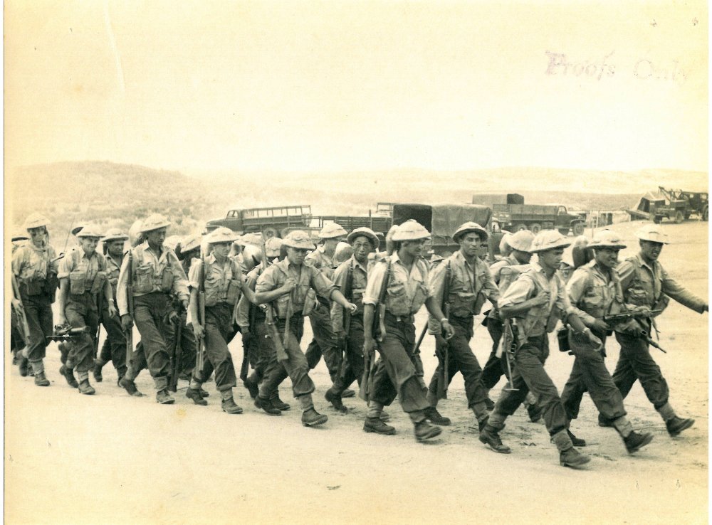 Reference NumberPhoto 13-962DescriptionACKNOWLEDGEMENT HAURAKI REGIMENT. A photograph of men marching past. Noted with file ‘D Whakatāne Coy - G Harawira 5 from right - Joe White 1st on right’. AC 121/11/93. J.P. 108/3. Stamped on reverse 'John D Jones, Studio & Candid Photographer, 407 Roseberry Rd Tokoroa'.