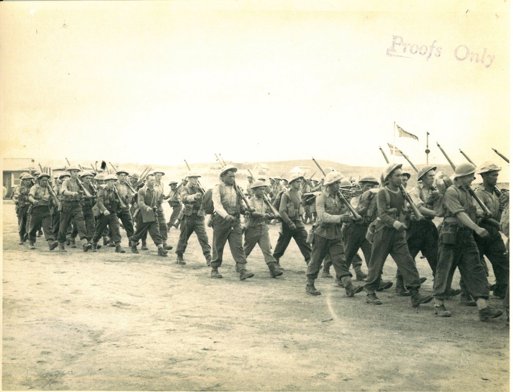 Reference NumberPhoto 13-966DescriptionACKNOWLEDGEMENT HAURAKI REGIMENT. A photograph of soldiers marching. AC 121/11/93. J.P. 108/8. Stamped on reverse 'John D Jones, Studio & Candid Photographer, 407 Roseberry Rd Tokoroa'.