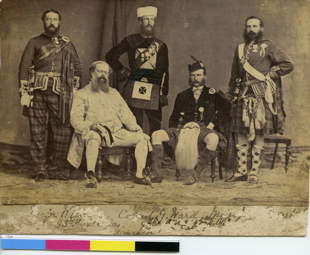 Reference NumberPhoto 16-031DescriptionScanned photograph of five gentlemen of the Empite in various uniforms from a family album within the (nee) Morrow family. At centre is Col. Robert Bole Morrow. The handwritten text at the base has worn away but the following can be made out. "Ensign Williams 93rd Highlanders. Colonel G. Ward, Sir ... Major...". Handwritten on reverse "Our plumes have waived in the Russian front, and the Indian glare and glow, we toss and shine of our thundering line was never shaken no!!!, and we're ready still, with good old will, When England bids us go !!!" No known copyright. Acknowledgement Tauranga City Libraries