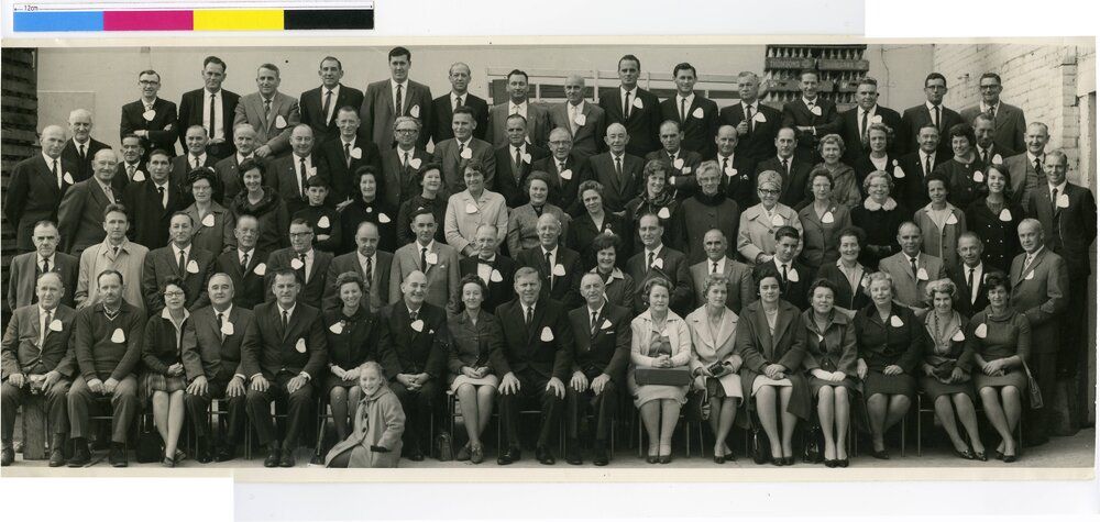 Reference NumberPhoto 16-188DescriptionScanned (and merged) group photograph by C.J. Leeden Photography (105 Lower St Dunedin). From MS 90 at Tauranga City Libraries Research Collections, a collection of notes, pamphlets, newspaper clippings and and reports from Reginald Talbot Hunt of the NZ Citrus Marketing Authority (1930s - 1970s). R.T. Hunt is standing at the third row, third from left (facing to his left and looking to his right). Crates at rear are marked "Thompsons". R.T. Hunt retired in 1971, dating this photograph from the late 1960s to 1971.