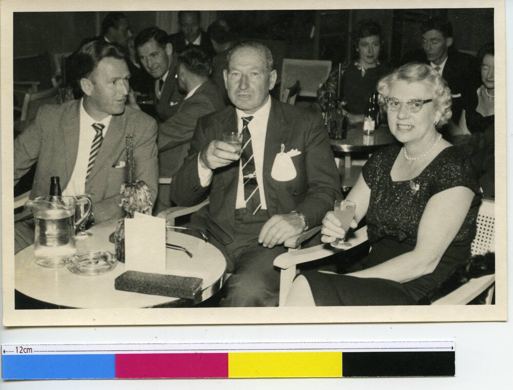 Reference NumberPhoto 16-199DescriptionScanned photograph David Gould (Photocraft Rotorua LTD), taken May 1961. From MS 90 at Tauranga City Libraries Research Collections, a collection of notes, pamphlets, newspaper clippings and and reports from Reginald Talbot Hunt of the NZ Citrus Marketing Authority (late 1930s - 1970s). Handwritten on reverse "mineral water manifesto(sp?) conference, 'Brents' 1961 May. Bruce - Reg (Hunt) - Grace (Hunt)". Original at Tauranga City Library. Copyright David Gould (Photocraft Rotorua LTD).