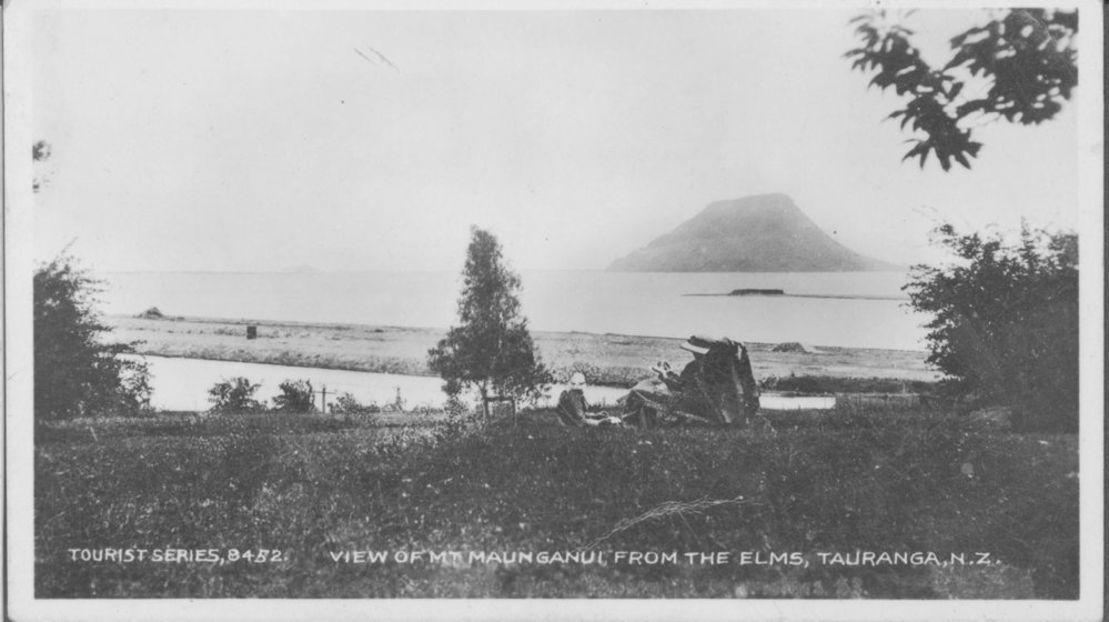 Reference NumberPhoto 99-105DescriptionCaption:Tourist Series 8452 View Of mt Maunganui fron the Elms Tauranga NZ Looking over Sulphur Point towards Mauao, with the rifle range butts visible on the sand bank in front of Mauao. Two women sketching in The Elms garden are probably Mrs Euphemia Maxwell and her daughter. c1900