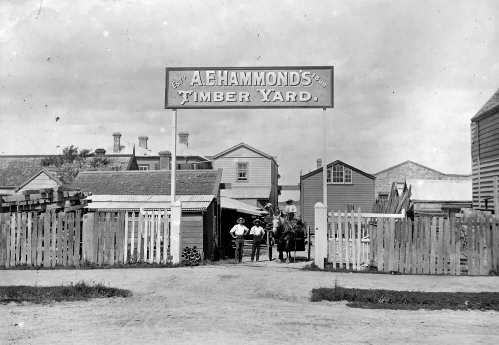 Reference NumberPhoto 99-1140DescriptionA.E.Hammond's timber yard running between The Strand and Willow Street. Originally started by David Lundon and John Conway, James Weir Gray bought the timber yard, and sold it on to A.E.Hammond in 1900. Photo c 1900s