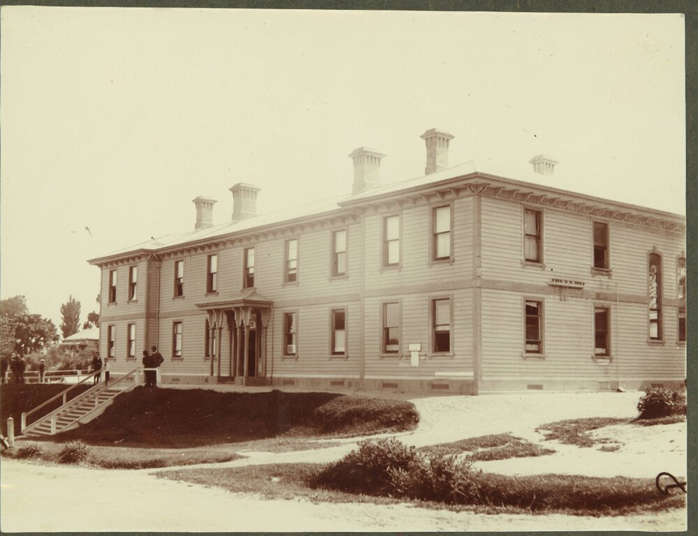 Reference NumberPhoto 99-340DescriptionGovernment buildings (old Post Office), Willow St., Tauranga pre 1902 fire. Probably c1900