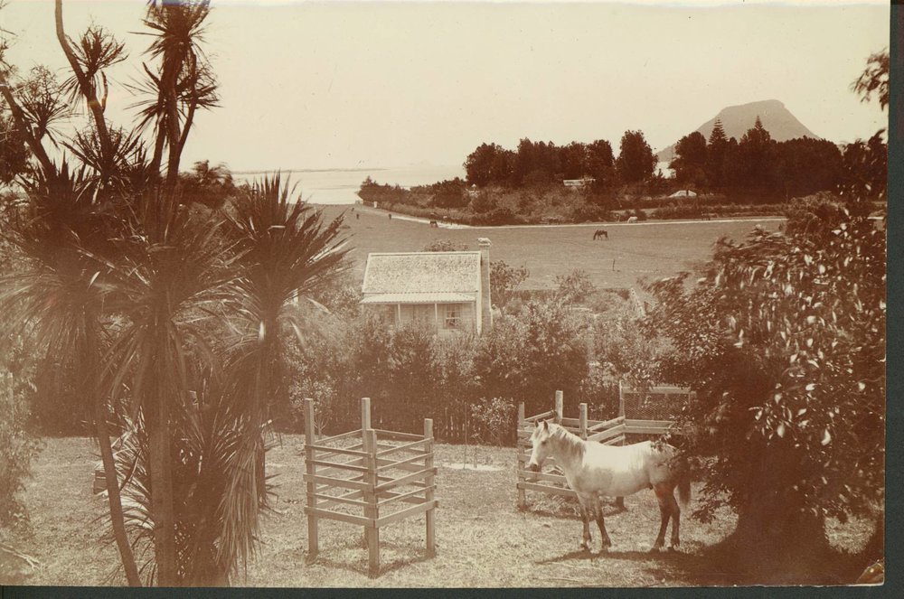 Reference NumberPhoto 99-798DescriptionLooking north east from the Tauranga Domain. Mauao can be seen behind the Norfolk Pines of The Elms. The belfry and part of the chapel are visible just below the left edge of the mission trees. The mission house roof is in the gap in the trees. c 1900.