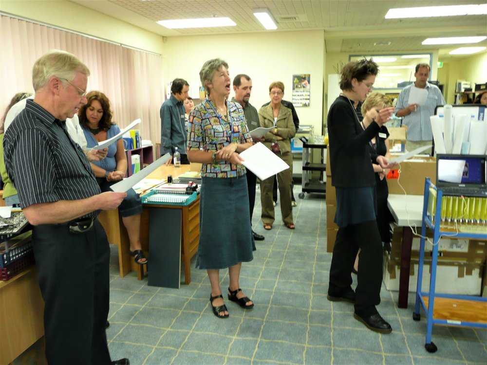 Date22 February 2008Reference NumberPhoto 1433DescriptionStaff sing waiata at Katrin's farewell. From left: Graham Baker, Amanda, Kelvin Choate (at rear), Creena Brungar (partially obscured), Stephanie Smith, Leslie Goodliffe, Judy Sail, Katrin, Hanna Peters, Andrew Compton.FormatDigitalPhotographer/CreatorSwitzer, Lee