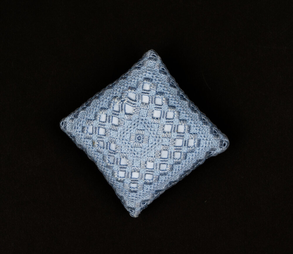 Datec. 1900s to c. 2008Reference NumberAms 406/1/2DescriptionPale blue threadwork pincushion, one of two.CreatorUnknownLevelItemFormatVariousExtent1 pincushionPhysical DescriptionPincushion size is 108mm by 108mm by 70mmLanguageEnglish