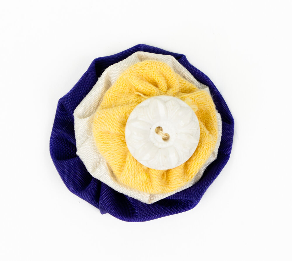 Date2018Reference NumberAms 436/6/3DescriptionCamellia rosette made with three fabric layers (yellow, white, purple), and a white floral button. Safety pin on the back.LevelItemFormatVariousExtent1 rosettePhysical DescriptionRosette size is 40mm by 40mm by 15mmLanguageEnglish