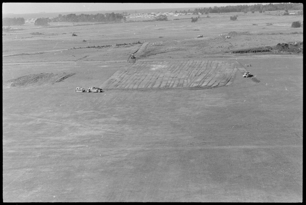 Aerial view of the Tauranga Airport showing outlined the location for the new runway (19 April 1966). Pae Korokī, accessed 04/04/2026, https://paekoroki.tauranga.govt.nz/nodes/view/83967