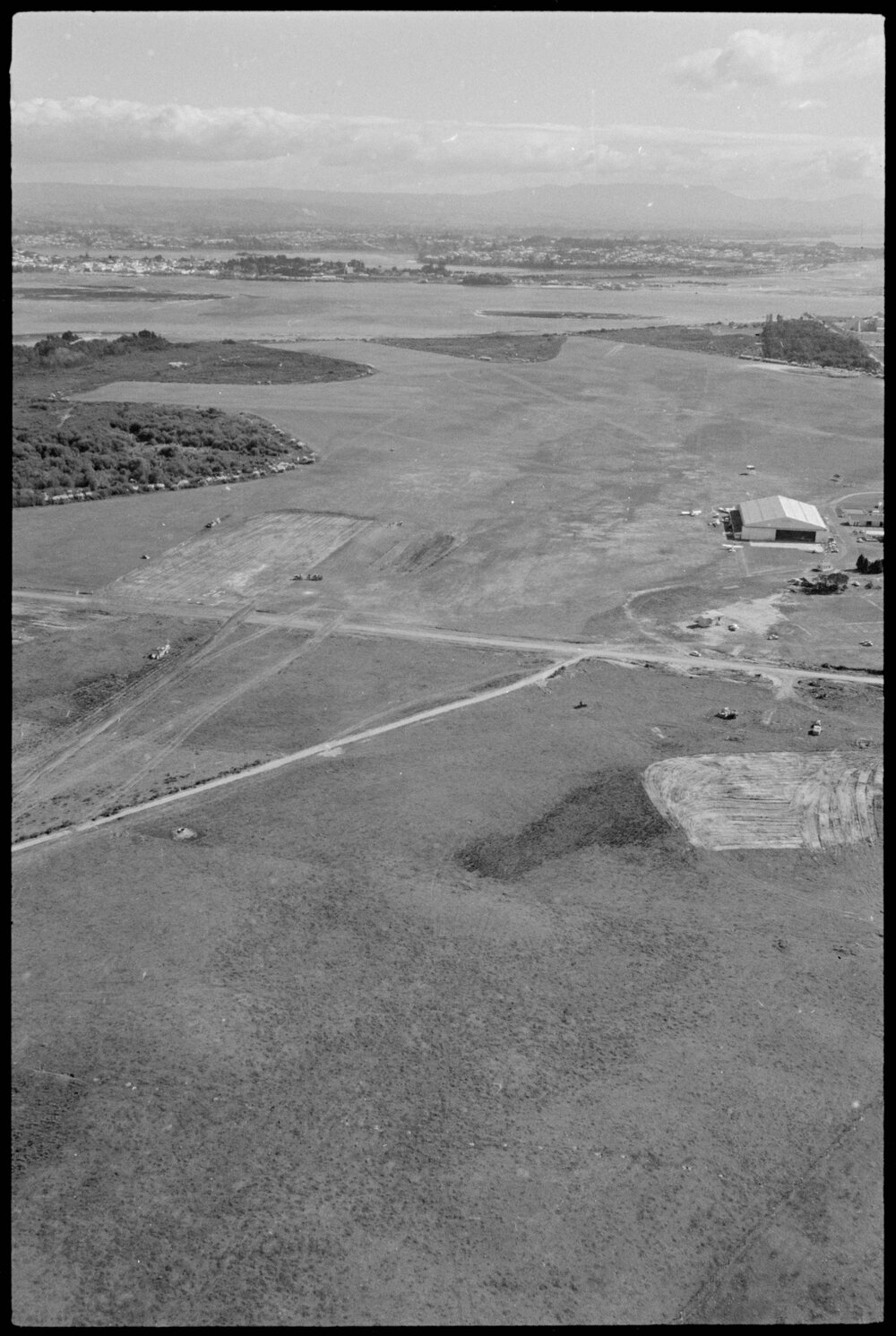Aerial view of the Tauranga Airport showing outlined the location for the new runway (19 April 1966). Pae Korokī, accessed 04/04/2026, https://paekoroki.tauranga.govt.nz/nodes/view/83970